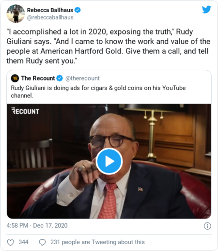 | | | Social media speed read | The president's lawyer appears to be trying out a career as an influencer: | | | | | | | Videos of the day | The Bidens sat down for an interview with Stephen Colbert. The president-elect said he believes that, once he's in power, Republicans will be more willing to cooperate. But he expressed "personal disappointment" about the conduct of Sen. Lindsey Graham (R-S.C.), who he said "was" a "personal friend": | | | | Jill Biden expressed surprise at the attacks on her doctoral dissertation, and Joe Biden said he isn't concerned about the accusations being made against his son, Hunter: | | | | And Seth Meyers called out Trump's enablers: | | | | | | |